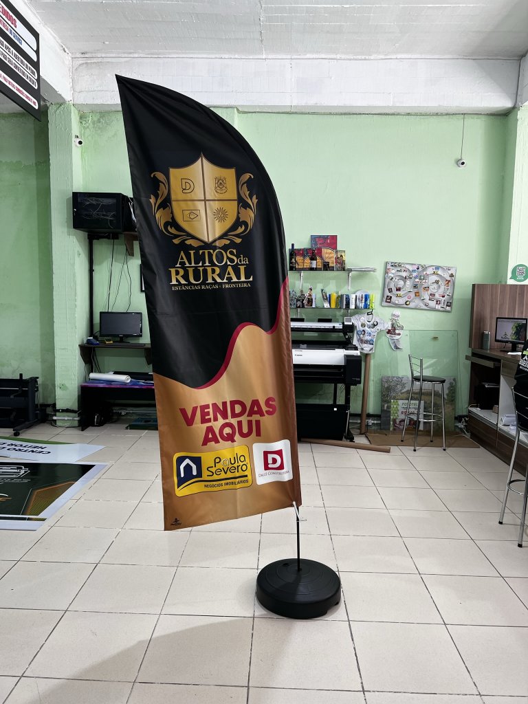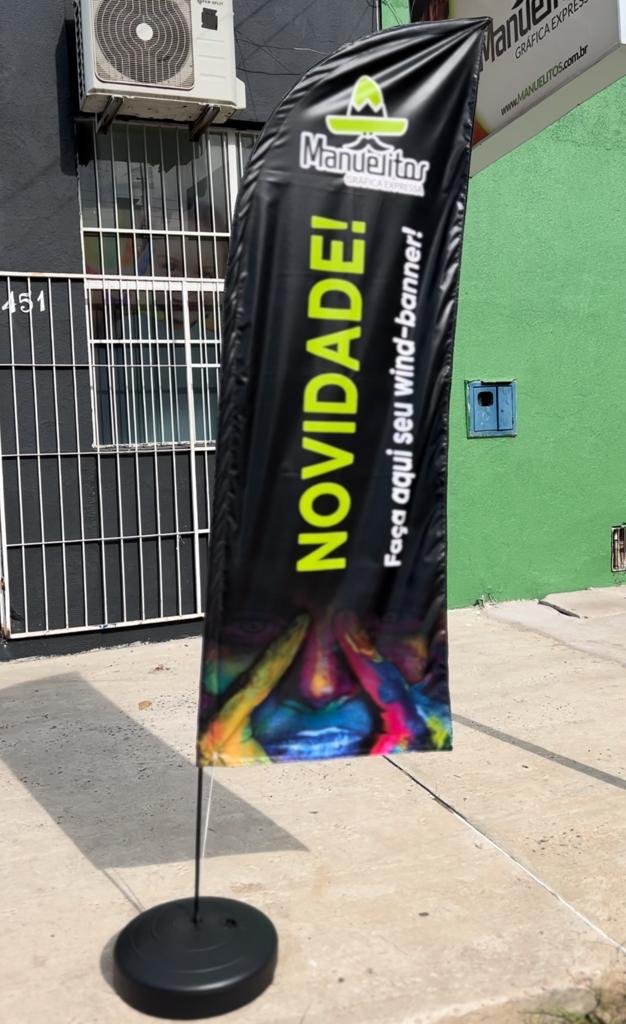 O Wind Banner é uma bandeira ela é ideal para divulgar sua empresa no ponto de venda. Este produto tem a vantagem de conseguir suportar ventos de até 30km/h. Além disso, é produzido com um tecido muito resistente com tamanho da haste de 2.50mts. O tecido com 73,5×206,5cm pode ser lavado sempre que necessário. vareta é de Aluminium e Base de plástico. Com estrutura e formato diferenciados, o Wind Banner é móvel, por isto tornou-se o melhor meio de divulgação externo. a mesma imagem é impressa dos 2 lados .